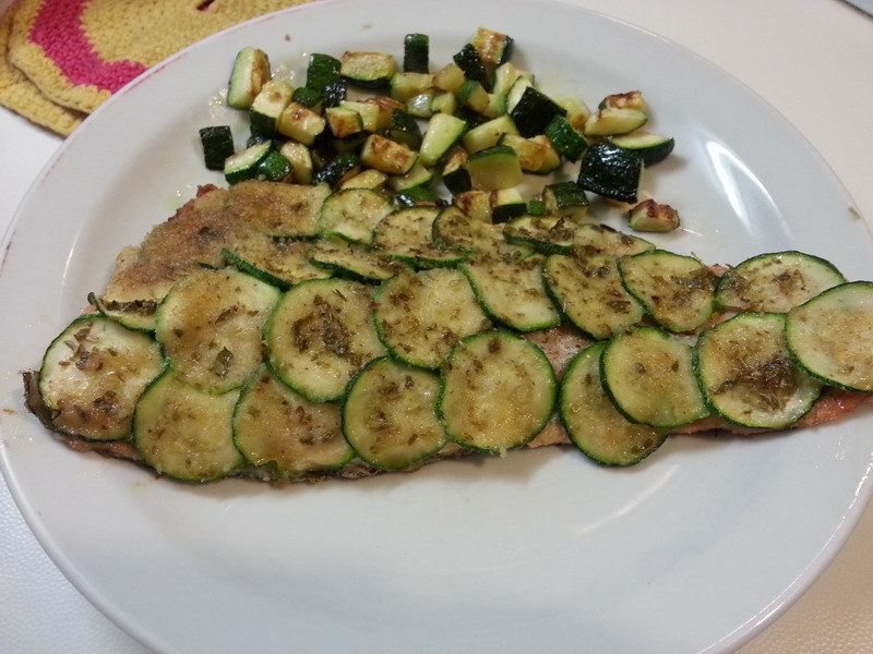 2 filetti trota salmonata da circa 200 gr l’uno, una zucchina media, pangrattato, origano, olio, sale aromatico, pepe.