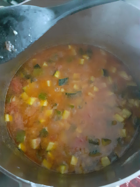 In una casseruola capiente olio,cipolla sottile,sedano,patate e zucchine,lasciamo rosolare il tutto ed uniamo i pomodori,sale ,pepe,basilico e prezzemolo, lasciamo cuocere il tempo necessario facendo attenzione a non asciugare troppo