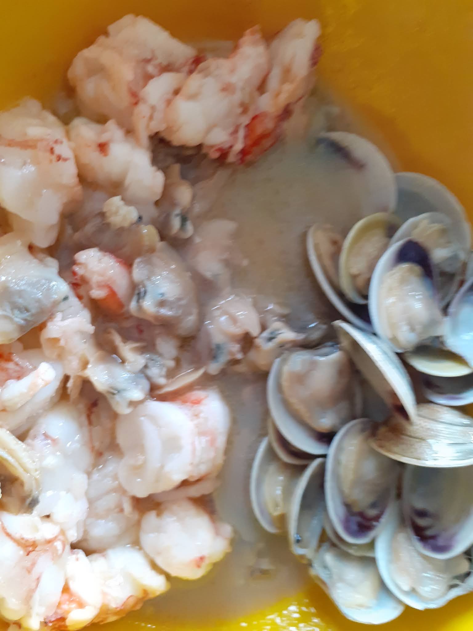 In un pentolino con poco olio e aglio far aprire i lupini ,sgusciarli (tranne alcuni ) e lasciarli a parte nel loro liquido filtrato….nello stesso pentolino senza alcun condimento se non quanto rimasto dei lupini ripassiamo velocemente i gamberi ,spegnamo e mettiamo da parte!.pronto il tutto iniziamo a comporre la ricetta cosi’: