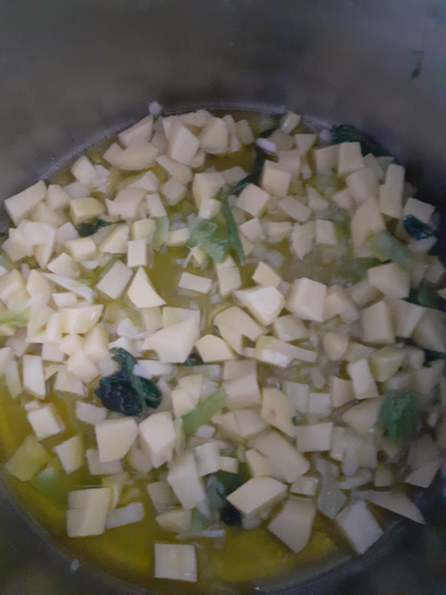 Sbucciare patate,lavare e tagliare a dadini,cosi’ pure zucchine,gamberi e sedano..