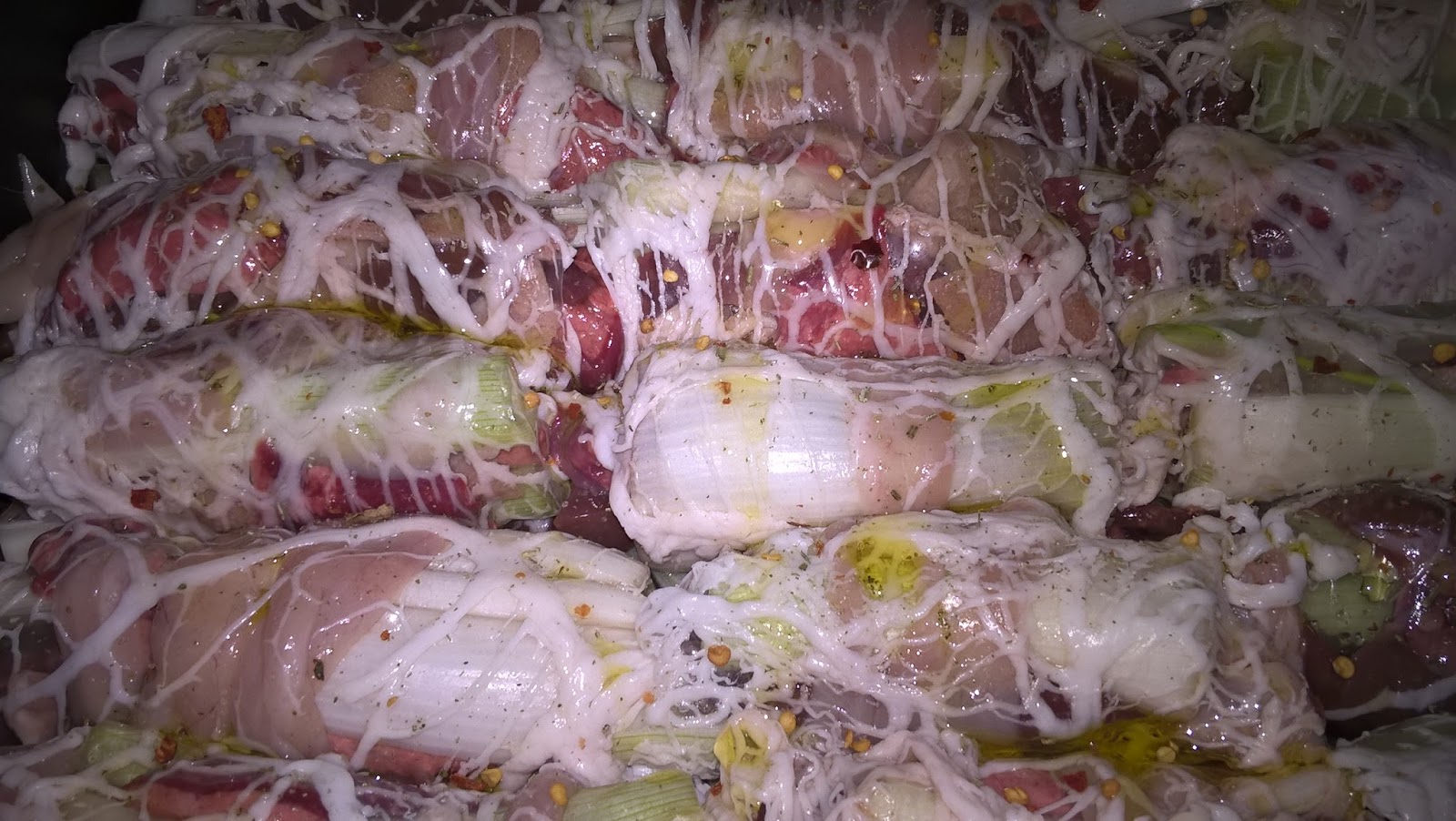 Mettere insieme le strisce di frattaglie con il formaggio al centro e le cipolle all’esterno facendo un mucchietto.