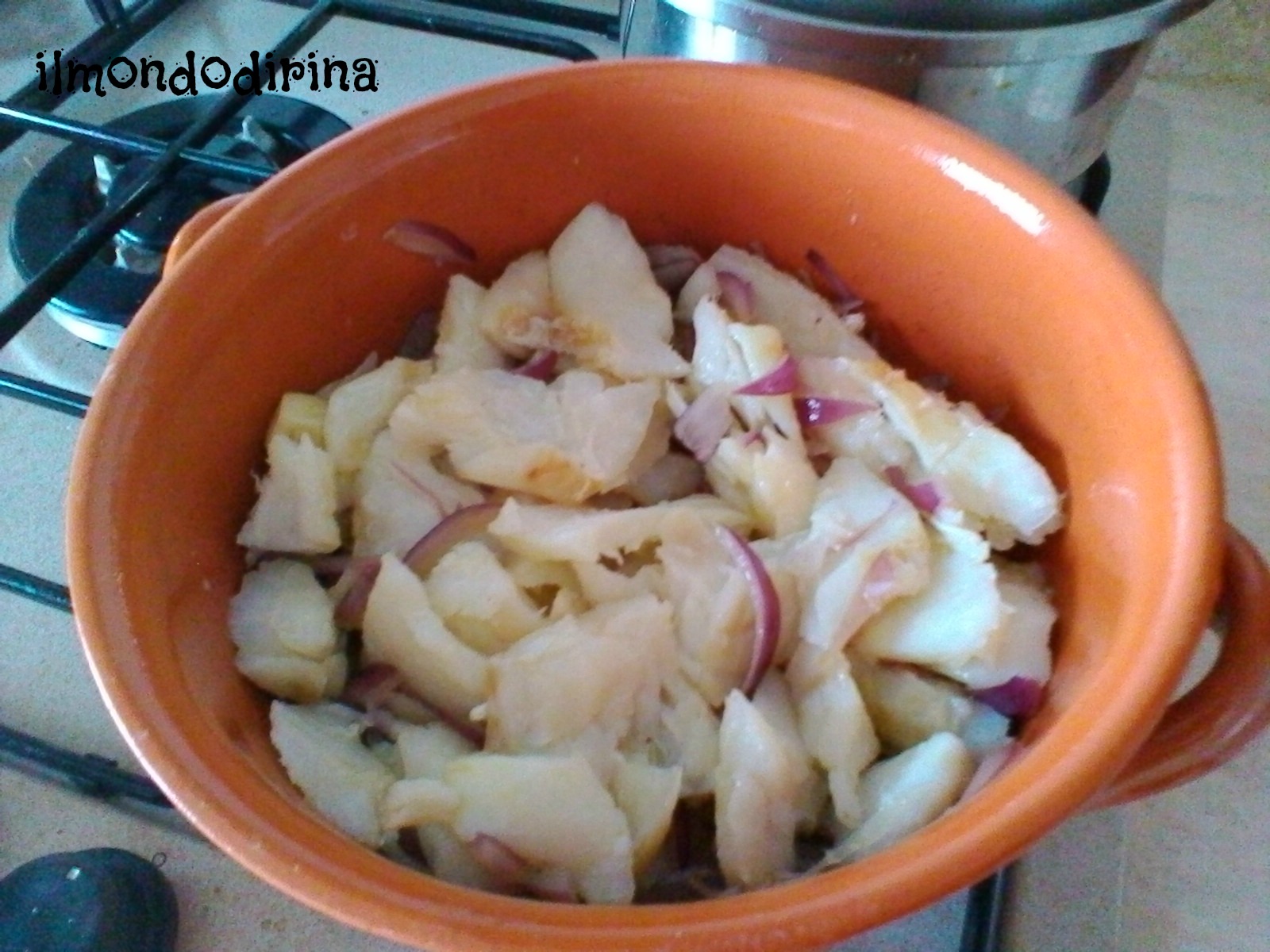 Sbollentate il baccalà per pochi minuti, quindi togliete pelle e lische e riducetelo in pezzi grossolani. In un tegame soffriggete in abbondante olio evo la cipolla, aggiungete il baccalà, facendolo insaporire per qualche minuto