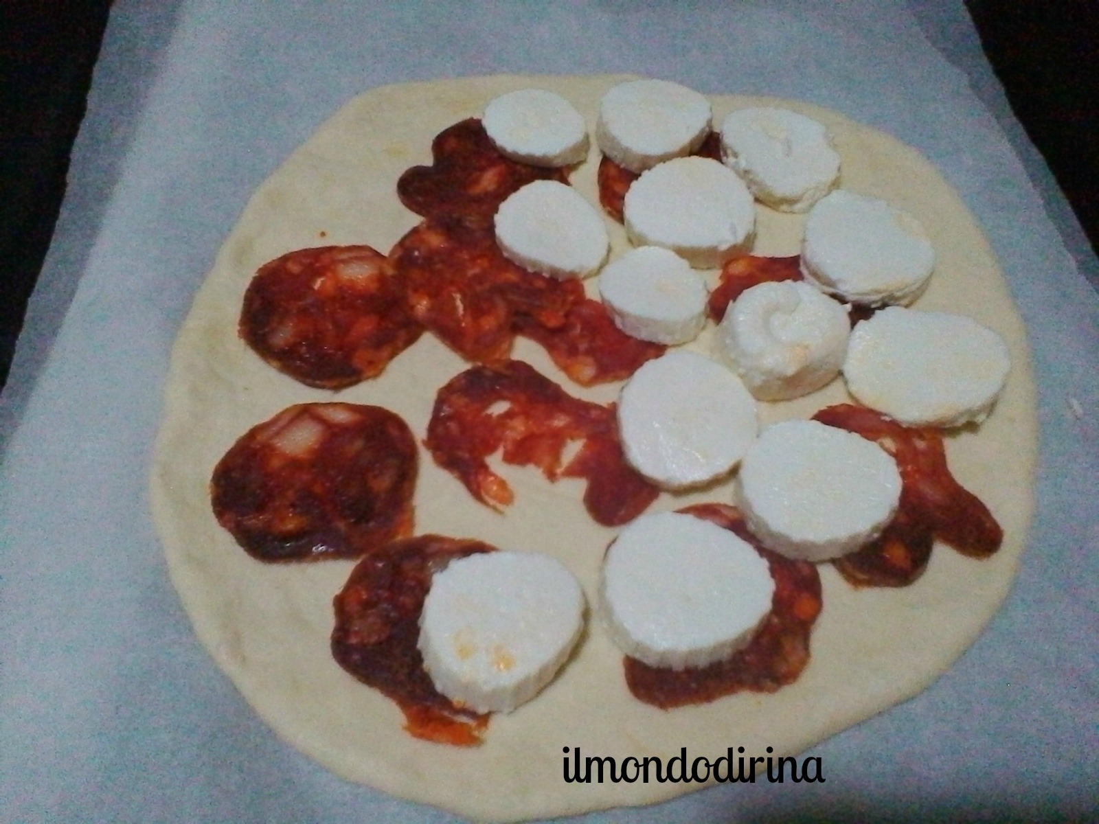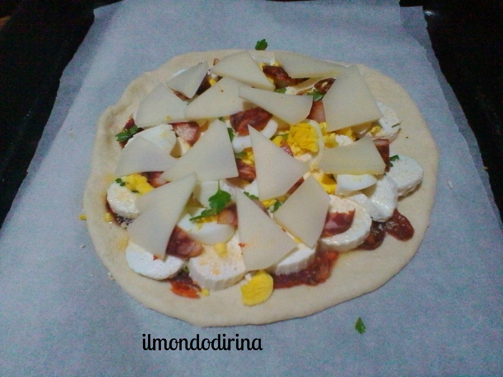 Dalla pasta del pane lievitata ricavate due dischi e tenete da parte un pezzettino. Prendete un disco di pasta e adagiatelo su una leccarda rivestita con carta forno, spennellatela con un filo d’olio e poi farcitela a strati: prima le fette di soppressata, poi la ricotta, la salsiccia, il caciocavallo e le uova. Infine versate l’uovo sbattuto.