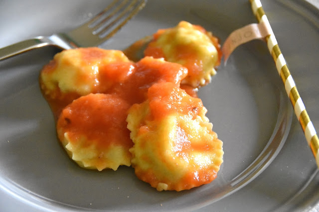 Scaldiamo del sugo di pomodoro in una padella molto capiente, versiamo i ravioli (cotti e scolati) per farli amalgamare e insaporire bene.