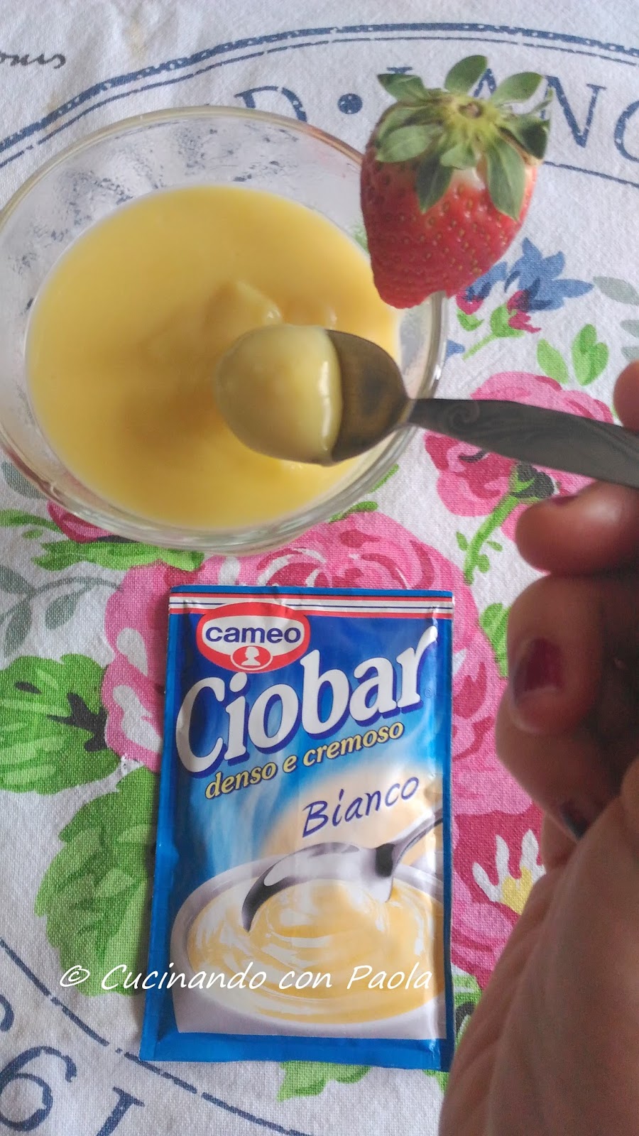 Spezzettare il cioccolato bianco e scioglierlo a bagnomaria a fiamma bassa. Quando è ben sciolto il cioccolato prendiamo le fragole e immergerle nel cioccolato. Lasciare solidificare in frigo. Ora passiamo a preparare il Ciobar: in un pentolino antiaderente versare il Ciobar e mescola con 125 ml di latte aggiunto un po’ per volta. Scaldare a fiamma moderata, sempre mescolando, finché Ciobar si addensa e giunge a ebollizione. Versare Ciobar in tazza e gustarlo! Ottimo con le fragole ricoperti di cioccolato bianco.
