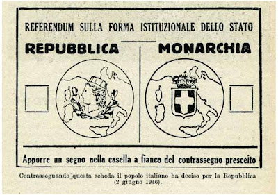 In seguito alla caduta del fascismo il 2 e il 3 Giugno 1946 con il REFERENDUM ISTITUZIONALE indetto a SUFFRAGIO UNIVERSALE gli italiani furono chiamati alle urne per riferire quale forma di governo: MONARCHIA o REPUBBLICA volevano dare al Paese.