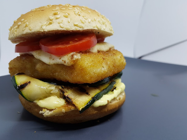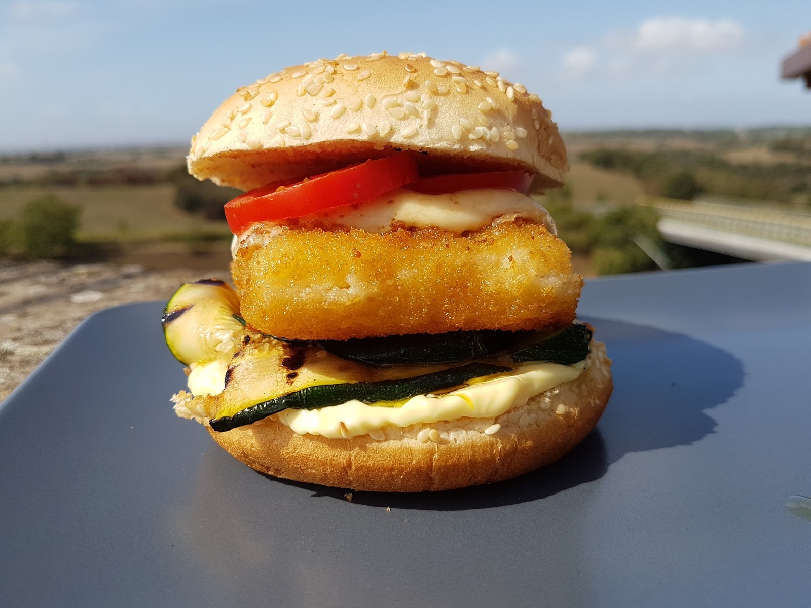 Iniziamo con il dividere in due un panino al sesamo e aggiungiamo, uno per volta, maionese, zucchine grigliate, Fishburger FRoSTA, scamorza grigliata e pomodorini.