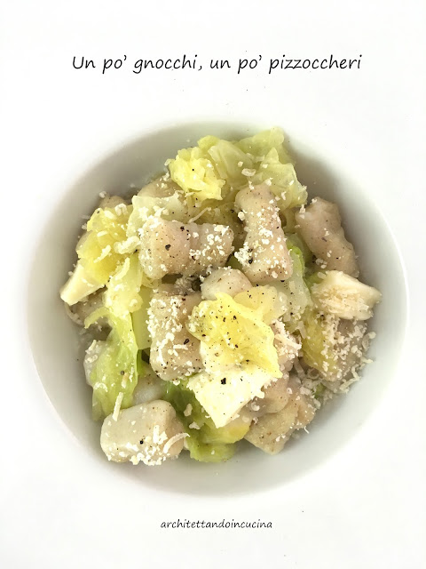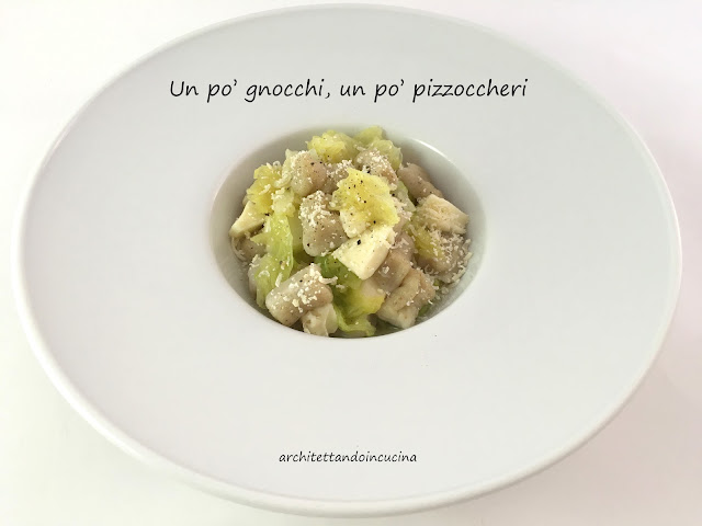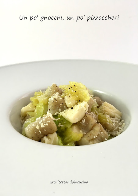 L’idea mi è venuta sabato scorso quando sono andata alla finale del Primo Master dell’MTC a Milano. Dopo la manifestazione ho cenato nel ristorante di una mia cara amica. Il locale si chiama Sciatt a Porter e fa cucina Valtellinese. Qui ho mangiato i pizzoccheri e mi è venuta l’idea. Praticamente ho usato tutti gli ingredienti dei pizzoccheri tradizionali negli gnocchi di patate, mentre per il condimento ho omesso la patata perché è già nell’impasto e non la volevo rendere predominante. L’insieme è stupendamente morbido ed avvolgente, proprio come i pizzoccheri. Ha i profumi della Valtellina e fa pensare a cime innevate, freddo ed è l’emblema del rifugio caldo ed accogliente dove fermarsi per scaldarsi e rifocillarsi dopo lo sci.