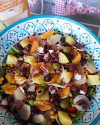 aggiungendo…patate a tocchetti,mais,sedano a tocchetti,pomodori a tocchetti,pera a fette sottili arance a spicchi vivi,mela a fette sottili,cipolline tagliate sottili,misto di olive ed infine il polipo