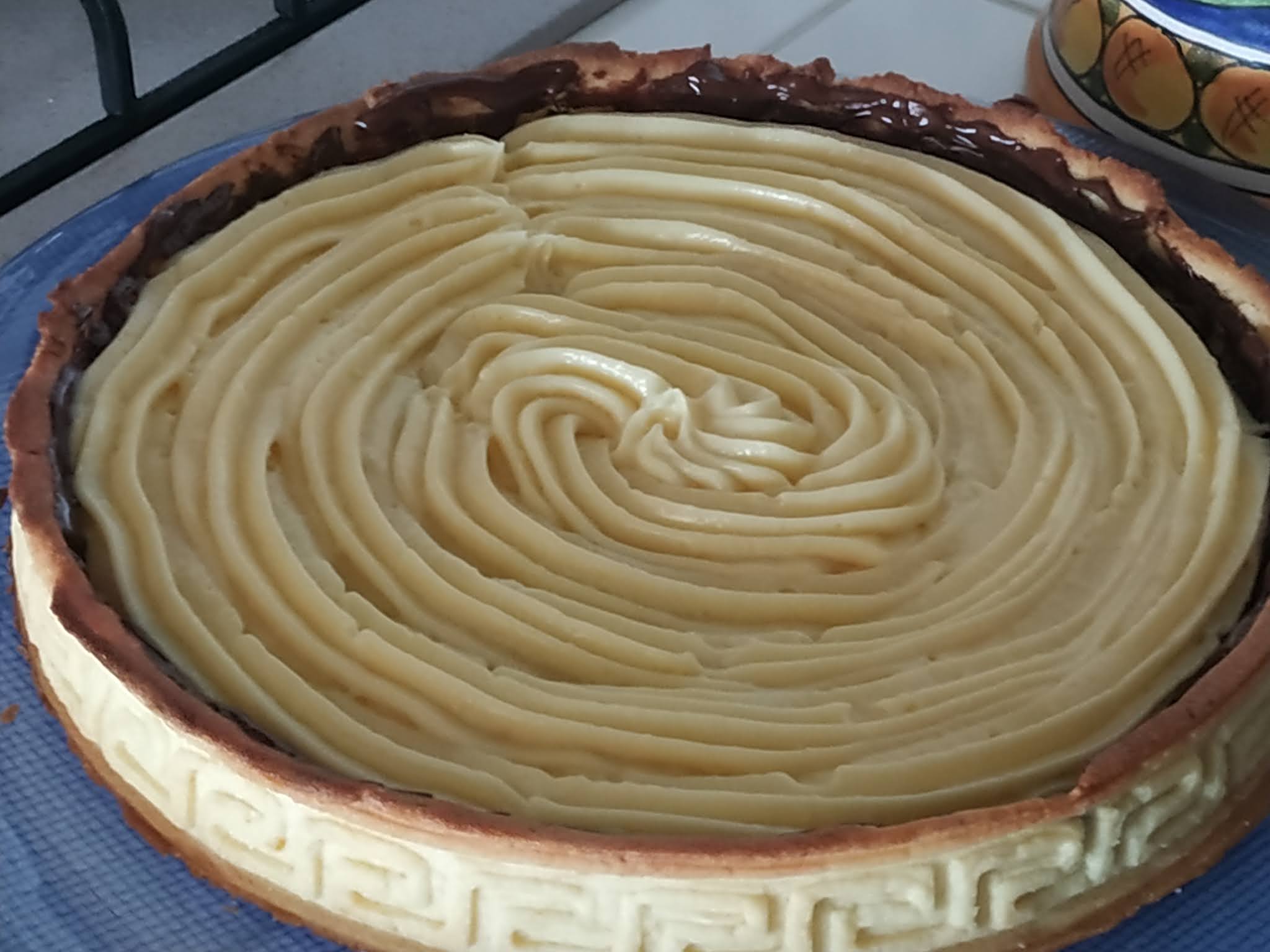 Montaggio della torta: spalmate il fondo di cioccolato sciolto a bagnomaria (circa 100 g); in questo modo la frolla non assorbirà l’umidità della crema, rimanendo croccante.