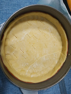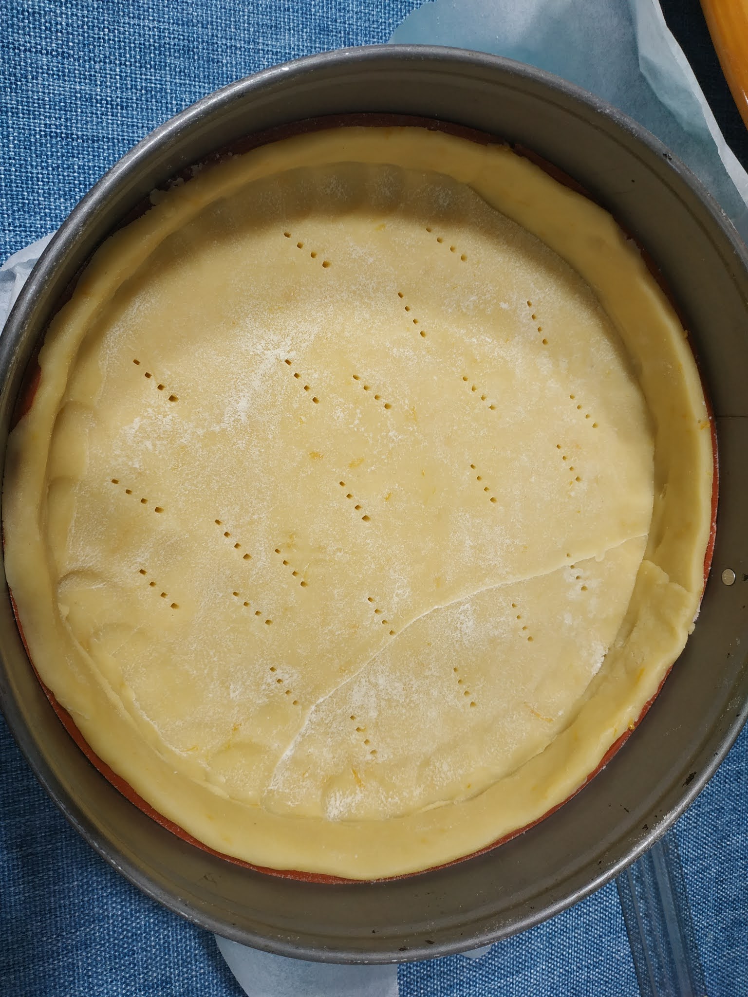 Ho ritagliato un disco per il fondo che ho bucherellato con una forchetta. Ho messo in frigo per un’altra mezz’ora e ho infornato a 180° per 30 minuti.