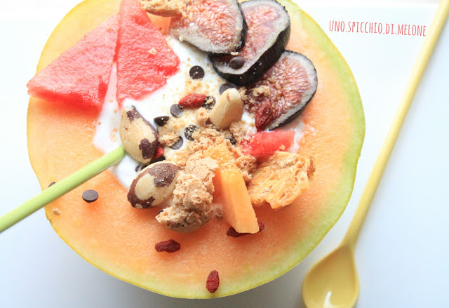 Per non avere però solo la pancia piena di liquidi prepariamo anche una sorta di YOGURT, FRUTTA FRESCA e SECCA…però mangiata DENTRO ed ASSIEME ad un MELONE!