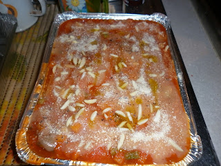 In ultimo ho messo delle lamelle di mandorle per dare croccantezza. E’ molto sugosa prima di infornare ma serve per cuocere le lasagne.