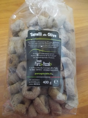 Taralli alle olive pacco da 400 gr, da sapore unico ed intenso. Friabili e croccanti, è la prima volta che assaggiavo dei taralli alle olive è devo dire che sono veramente squisiti ottimi da abbinare ad antipasti di salumi e formaggi.