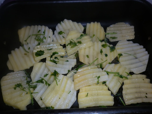 Dovrete solamente farli andare per un 15 minuti. Devono essere ancora croccanti, finiranno di cuocere in forno. Mentre loro vanno lavate, pulite e affettate le patate. Ho usato uno strumento per farle diverse ma vanno benissimo anche affettate con un coltello semplice.