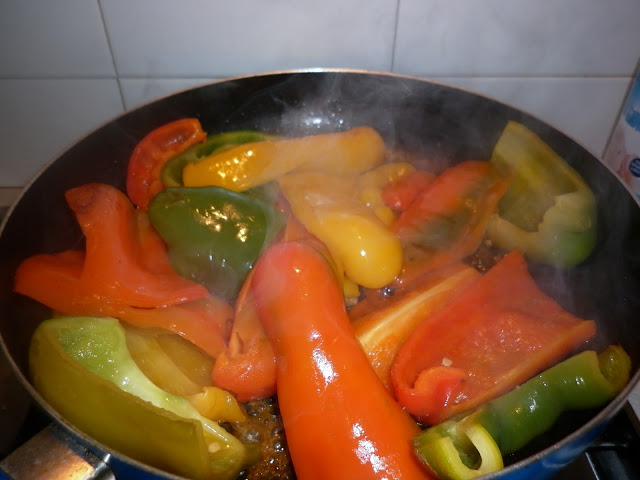 E’ una ricetta semplice e veloce ma molto saporita grazie all’affumicato della mozzarisella. Cominciate con lavare e tagliare a fette molto grandi i peperoni. Metteteli in padella con aglio, sale, pepe e erbette.