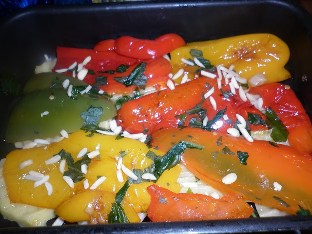 Fate uno strato di mozzarisella affumicata e ricoprite di peperoni su cui aggiungerete le mandorle e le erbette:
