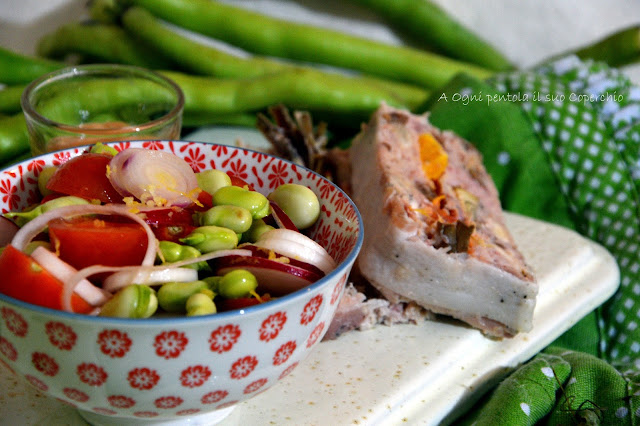 Accantonata la terrina con il baccalà non ho voluto demordere e quindi mi sono rimessa all’opera, questa volta con la carne, sono passata dal macellaio, volevo una carne magra e poco saporita perché volevo far emergere gli alti sapori e così ho deciso di utilizzare un macinato di tacchino al quale ho aggiunto della soppressata tritata, delle mandorle, l’uvetta e uno strato dolce amaro fatto con carciofi e arancia rossa. Come accompagnamento ho voluto fare un omaggio alla primavera con un insalatina fresca di fave, pomodorini, cipolla di Tropea e Ravanelli ed una salsa di yogurt ai peperoni.