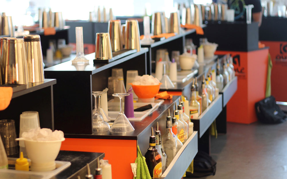 Durante la lezione, ogni allievo ha la sua postazione equipaggiata di tutti gli strumenti utili per la preparazione di ogni cocktail e ad ogni lezione verranno insegnate le varie posizioni delle bottiglie in funzione del loro utilizzo e le impugnature, fino ad arrivare alla creazione di un cocktail perfetto.