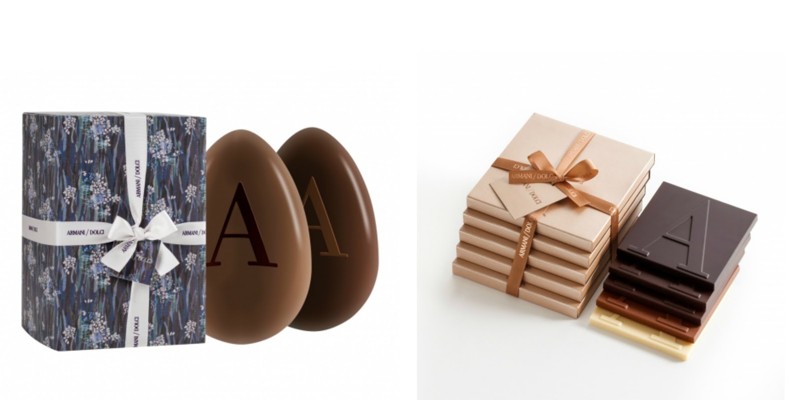 Il classico uovo di Pasqua da 200 gr con sorpresa, al cioccolato extra fondente 75% o al cioccolato al latte, e decorato con l’iconica lettera A di Armani a contrasto.