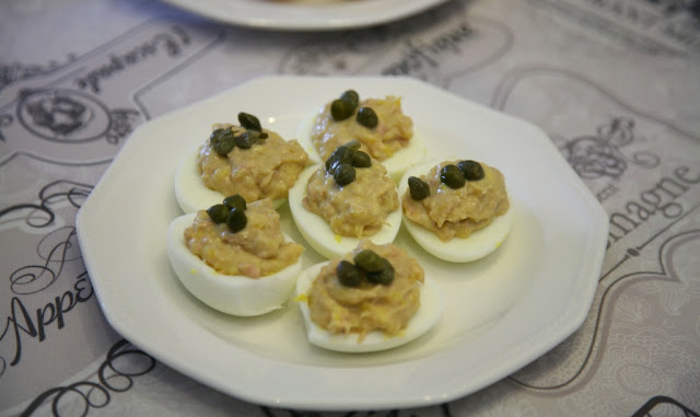 Con il composto ottenuto riempire le calotte di bianco d’uovo e decorare con i capperi. Mettere in frigorifero un paio di ore prima di servire.