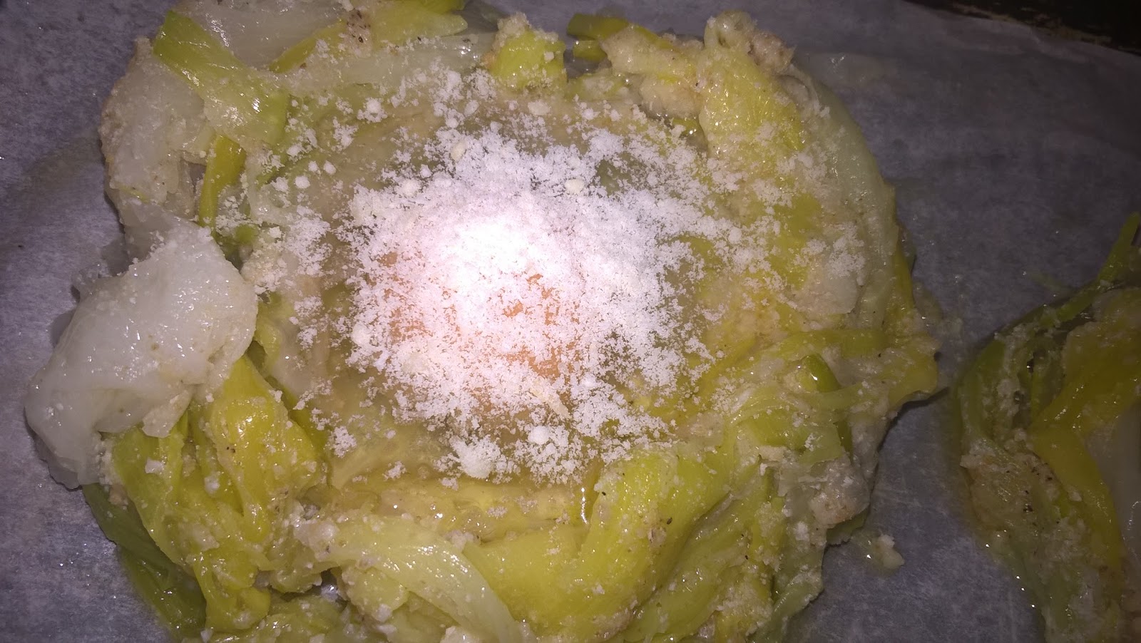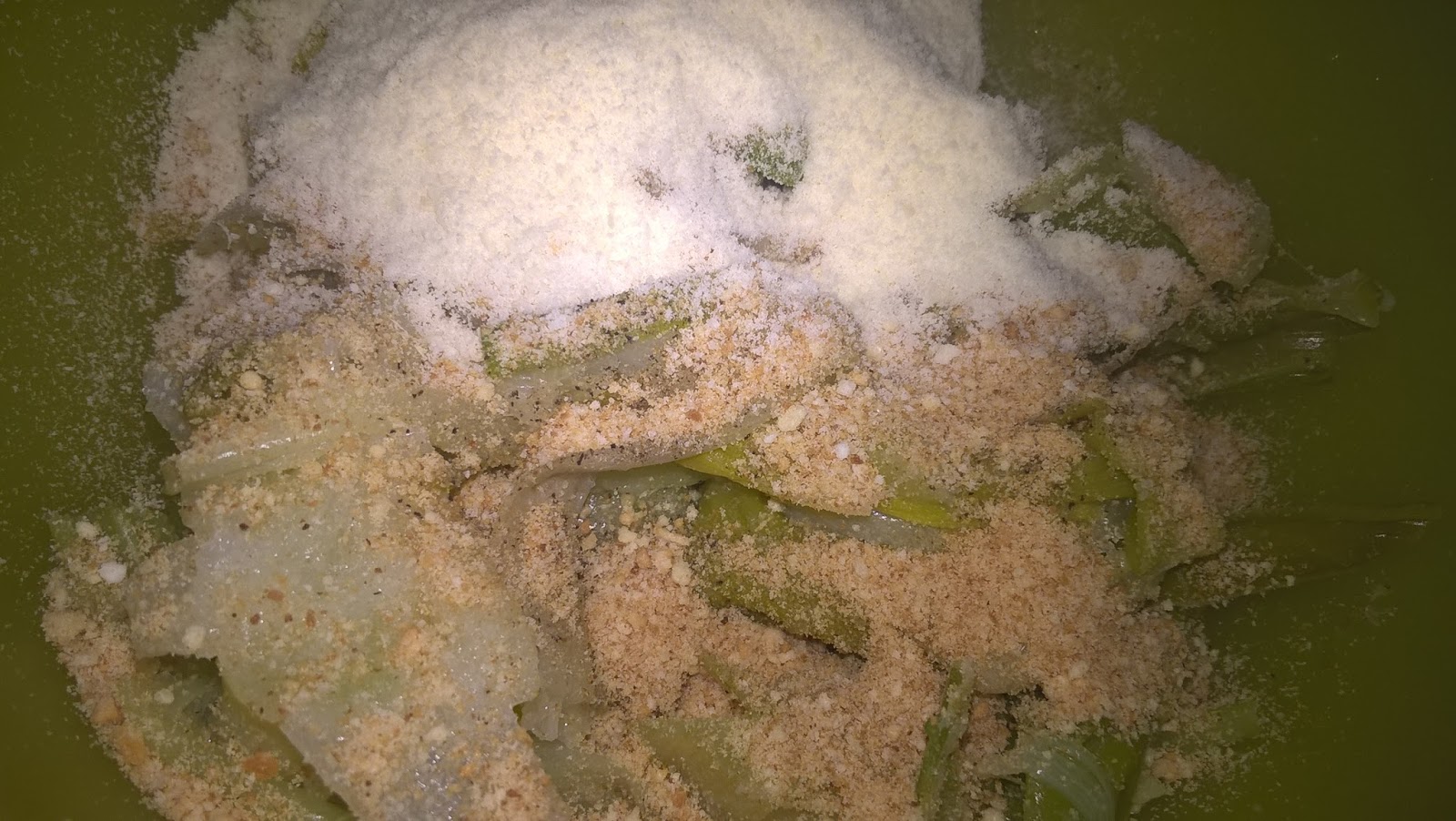 Mescolate le striscioline di porrri con pangrattato tostato (100 g), un filo di olio extravergine d’oliva e parmigiano grattugiato (50 g), pepe nero a vostro gusto.