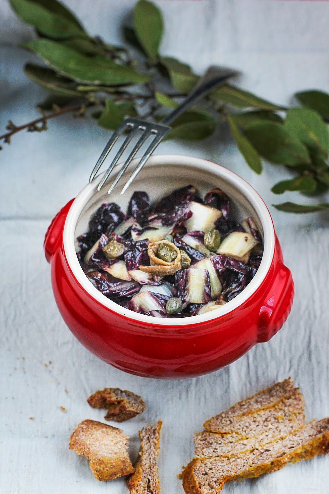 Quando le alici si saranno disciolte, eliminate l’aglio ed aggiungete il radicchio, salate, pepate e portate a cottura a fiamma medio-bassa in circa 10’, mescolando spesso. Servite in tavola ben caldo, io l’ho servito in una (mini)zuppiera di LeCreuset.