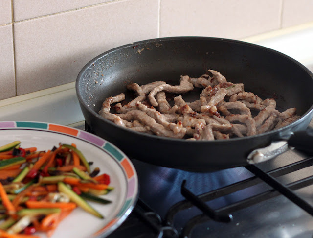 English. A bit of scaloppini, some chinese influences… this straccetti recipe is born from the fusion of different flavours. You know how much we love ethnic food: we like to remake them by ourselves, adding a personal touch, and this is one of them. So we got the veal strips, floured with corn starch, glazed with beer (double malt beer), add a lot of vegetables and a handful of toasted peanuts. We got a tasty main course, full of flavours. Try it and let us know if you like it!