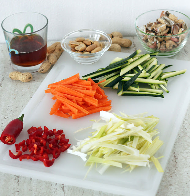 English. Chop the chilli. Julienne all the vegetables. Use only the green part of the zucchini (you can use the leftovers for a soup or a frittata). Shell the peanuts.