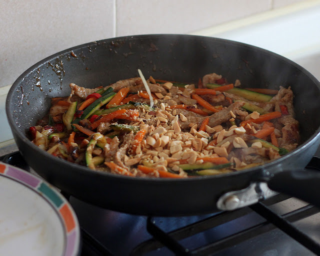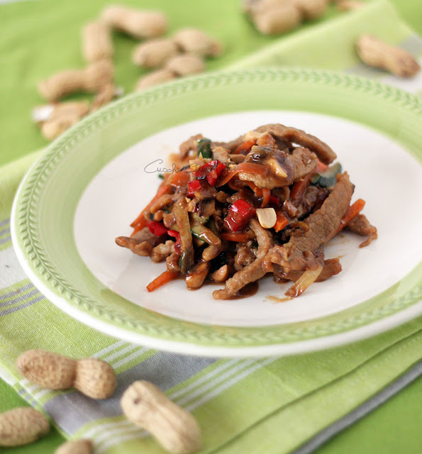 English. Next step is: add the vegetables and the water to the meat. Cook for about ten minutes and that’s all. Turn off the heat, add chopped peanuts and serve. Enjoy!