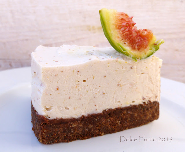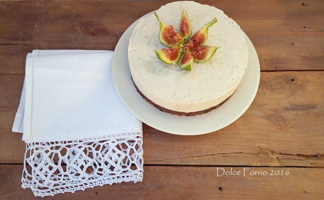 Sciogli il cioccolato a bagnomaria o nel microonde. In un mixer riduci i biscotti in farina, unisci al cioccolato fuso, amalgama bene e ricopri il fondo di uno stampo con chiusura a cerniera. Metti in frigorifero a rassodare. Monta la panna. Versa il Formais in una boule e aggiungi la marmellata di fichi in quantità a tuo piacere, la dose che io ho messo è in funzione alla panna vegetale che è già zuccherata, tu assaggia per regolare la dolcezza a tuo gusto. Mescola con perizia, io ho usato un frullatore ad immersione per sciogliere bene il formais ed i pezzi eventualmente presenti nella marmellata. Ora aggiungi la panna, amalgama senza smontare e versa sulla base fredda. Puoi servire già dopo qualche ora, ma sarà perfetto se preparato il giorno prima. Togli l’anello con delicatezza, passa magari la lama di un coltello tra il dolce e lo stampo per aiutarti a sformarlo. Al taglio fai attenzione alla base che è piuttosto croccante e può risultare dura, ma ti assicuro che è un contrasto decisamente godibile con la parte cremosa. Io preferisco aggiungere la frutta fresca, nuda, anche a fettine, all’ultimo minuto prima di servire, ma nulla vieta di usare marmellata diluita e passata al colino per una versione più tradizionale.
