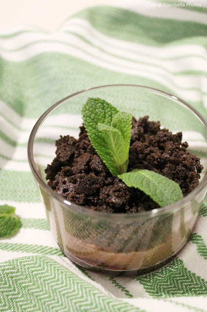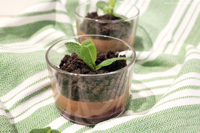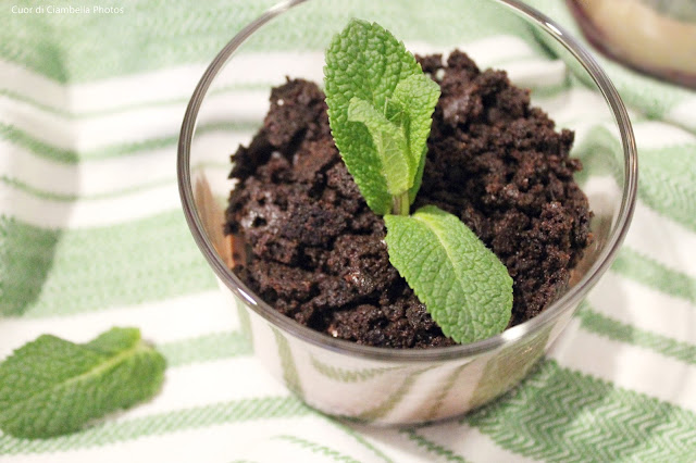 Eccoci con la ricetta di marzo di #dolcementegreen (se non conoscete questa rubrica e vi siete persi le altre puntate cliccate qui)! Oggi io e la carissima Paola vi proponiamo un dolce al cucchiaio dall’esilarante effetto ottico!! Ebbene si, sembra un vasetto di terra con una piantina, ma in realtà è una mousse di puro cioccolato fondente (senza aggiunta di grassi e zuccheri) con in abbinamento la marmellata di lamponi che da la giusta acidità per contrastare la corposità del burro di cacao ed un crumble al cacao per un tocco di dolcezza e di croccante. Perfetto per gli occhi, il palato, ma anche per il cuore (poi scoprirete il perché)!! Vi svelo che questa ricetta l’ho pensata per il mio ragazzo che non ama i “dolci troppo dolci” difatti questo dessert a differenza delle classiche mousse con panna non è affatto stucchevole. Essendo un dolce senza uova, latte e burro è perfetto per concludere il pasto senza appesantirsi troppo, in più è adatto anche a chi segue una alimentazione vegana o ha particolari intolleranze. Si può rendere il dolce anche senza glutine utilizzando la farina di riso per il crumble.