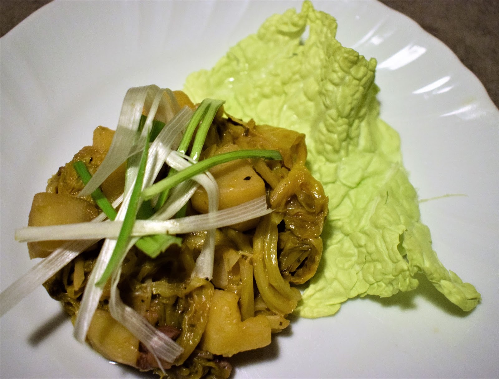 Tagliate il cavolo verza a pezzi non molto grandi e fatelo cuocere in una padella con il brodo e aggiungendo acqua se si asciuga troppo. Quando sarà perfettamente cotto, unite anche le patate e il porro e fate insaporire il tutto. Servite caldo.