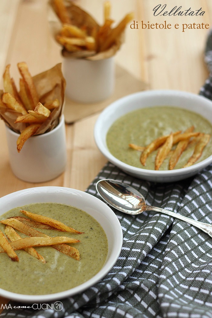 E’ da un po’ di giorni che non pubblico qualcosa sul blog, io e mio marito ci siamo alternati con l’influenza, quindi ho dovuto trascurare la cucina, prima per fare l’infermiera poi per fare la malata. Per fortuna adesso va meglio e per coccolarci un po’ cosa c’è di meglio di una calda vellutata? Qualche tempo fa sfogliando un numero de “I quaderni di Alice” avevo notato questa ricetta con le bietole, una verdura che amo molto, e proprio ieri me ne è stata regalata una cassetta. Ne ho subito approfittato per preparare questa deliziosa vellutata, resa più golosa dall’aggiunta delle patatine fritte.