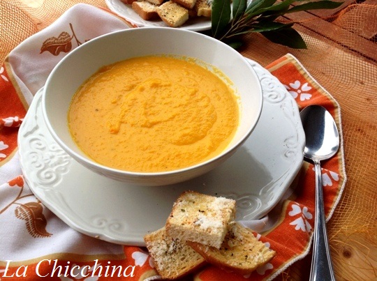 Le vellutate sono preparazioni semplicissime: verdure soffritte con un filo d’olio, arricchite con ingredienti aromatici (esempio lo zenzero) e spezie (come la curcuma, il pepe e la cannella): io ho optato per l’alloro che conferisce a questa crema una nota accattivante e golosa.