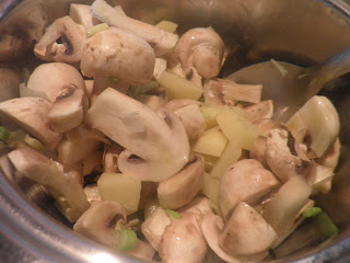 Fate rosolare i funghi e le patate tagliate a tocchetti con aglio o cipolla secondo i vostri gusti ( io ho messo un cipollotto fresco), olio extravergine d’oliva; quindi allungate con brodo vegetale e aggiustate di sale.