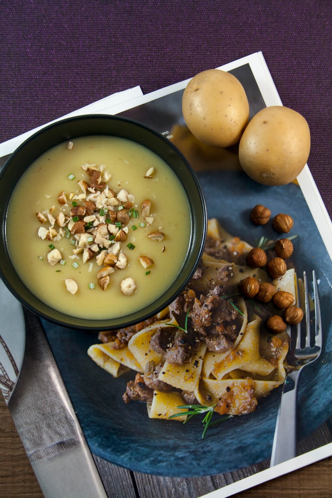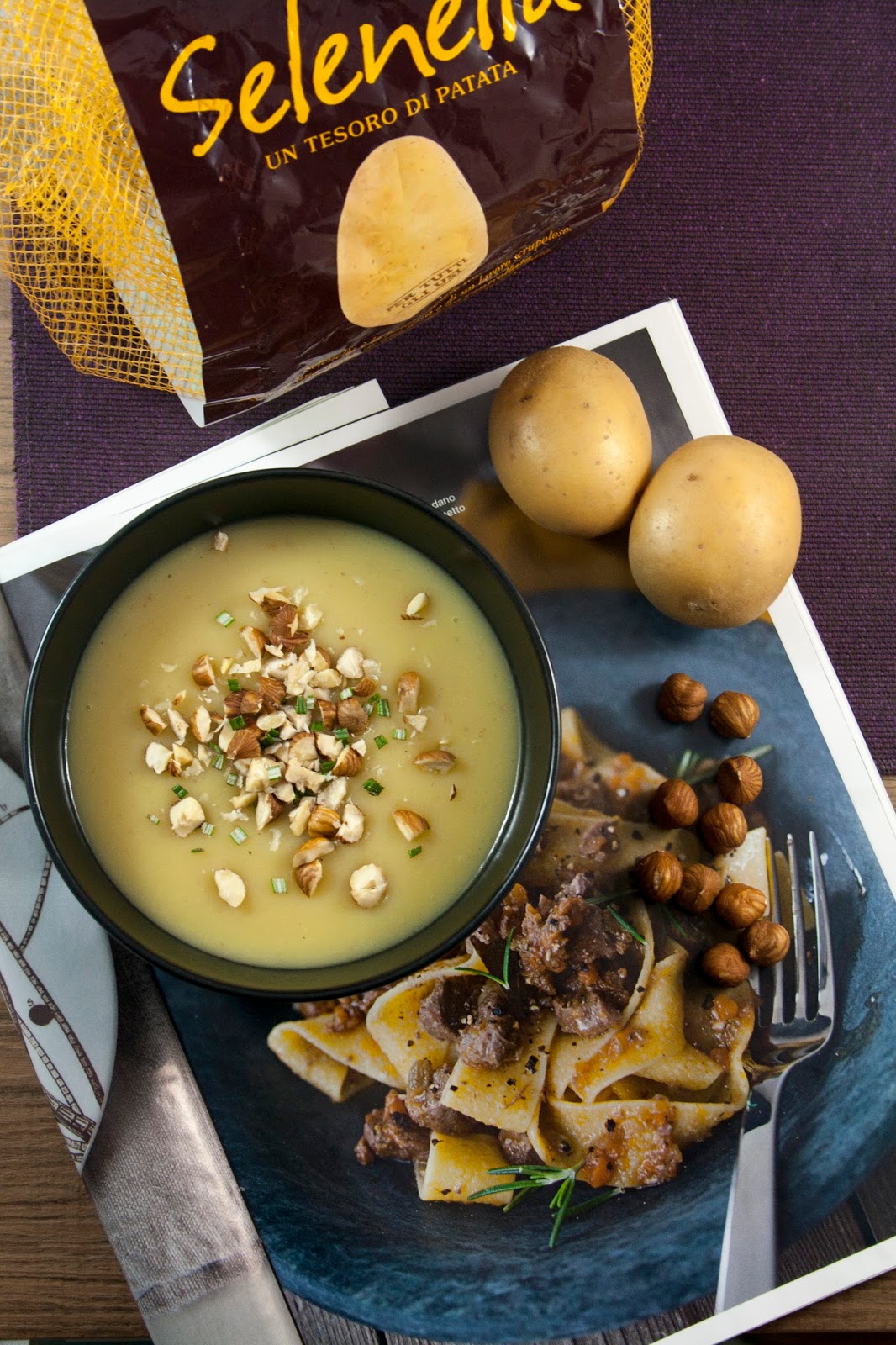 Servire la vellutata aggiungendo le nocciole e il rosmarino tritati, del parmigiano grattugiato e un filo d’olio evo.