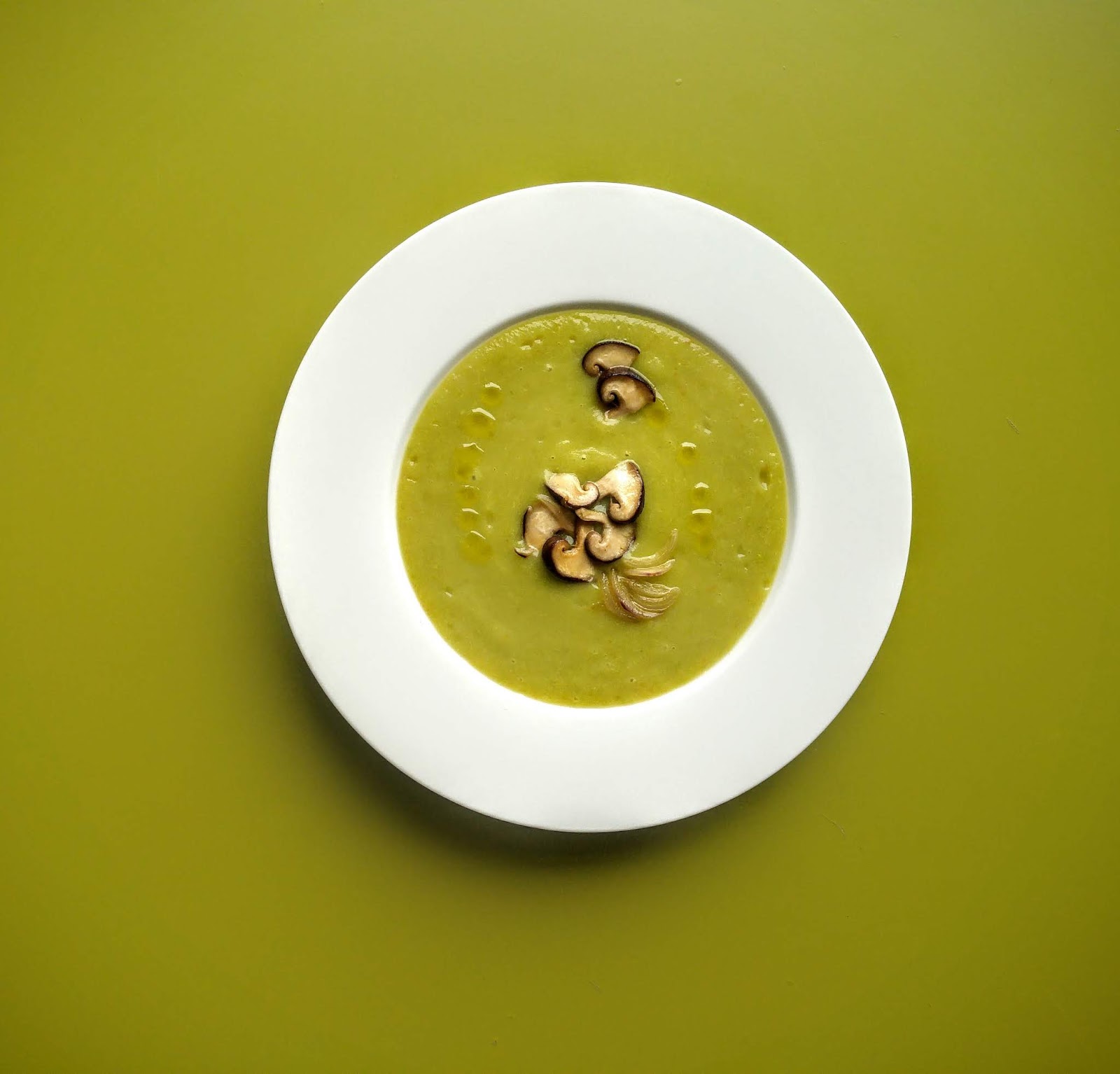 Lava e sbuccia la patata e taglia a dadi, sgrana i piselli, metti a bollire in un litro circa di acqua salata. Nel frattempo prepara un piccolo soffritto con un pezzetto di cipolla, di carota, di peperoncino e di zenzero con poco olio, sale e qualche cucchiaio d’acqua. Dopo circa 20 minuti patata e piselli saranno cotti. Unisci il soffritto e aggiusta di sale. Metti tutto nel frullatore e riduci a vellutata.Pulisci il fungo, taglia a fette spesse, fallo saltare in padella qualche minuto insieme a fettine sottili di cipolla. Versa nel piatto la vellutata, aggiungi le fettine di funghi e di cipolla, qualche goccia d’olio e voilà, il piatto è pronto!