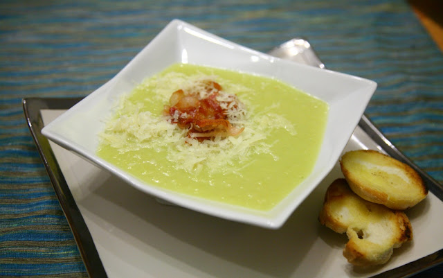 Servire la vellutata con il bacon croccante, una bella grattugiata di montasio e crostini tostati.
