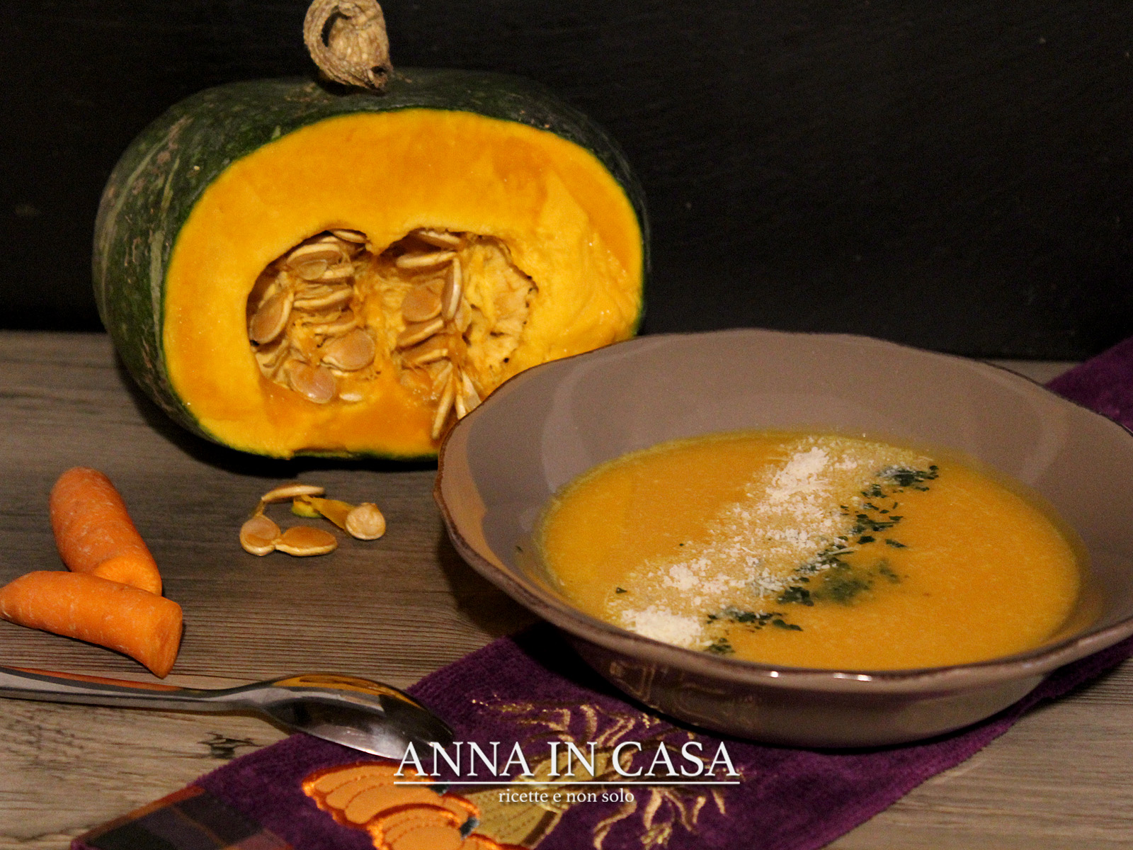 La vellutata di zucca non è certo una novità per nessuno ma se cerchiamo di insaporirla un po’ e la presentiamo bene, facciamo sempre e comunque bella figura.