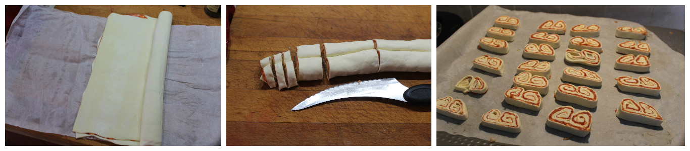 Tagliate ora i ventaglietti di circa un po’ meno di un centimetro di spessore ne dovresti ottenere circa 24; per non sbagliare la misura io taglio il rotolo prima metà, poi ognuna ancora metà, e in tre fettine ogni pezzetto ottenuto.