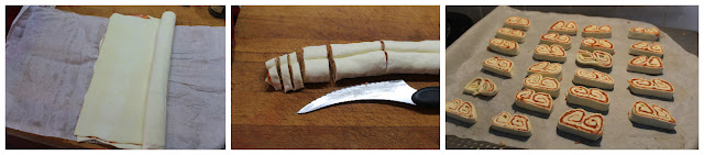 Arrotolate ora l’estremità lunghe verso il centro della pasta, prima la parte destra e poi la parte sinistra. In questo modo otterrete una sorta di cuore lungo, avvolgetelo nella sua carta forno e fatelo riposare 10 minuti in freezer oppure mezz’oretta in frigorifero, così sarà più semplice e ricavare ventaglietti.