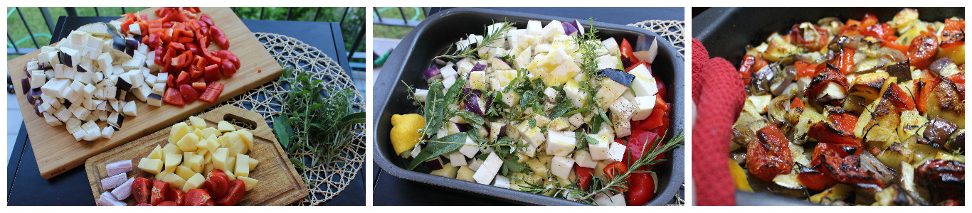 Questo contorno oltre a prepararsi quasi da solo, grazie alla cottura in forno, è un tripudio di colori e sapori. Potete accompagnarlo a carne o pesce alla griglia, oppure mangiarlo con formaggio caprino leggermente scaldato.