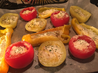 Lavare e pulire le verdure, asciugarle con fogli di carta casa e tagliarle a metà o a quarti, come vi viene più comodo, svuotare le patate e i pomodori (con l’interno potete, aggiungendo altre verdure, preparare un minestrone ricco).