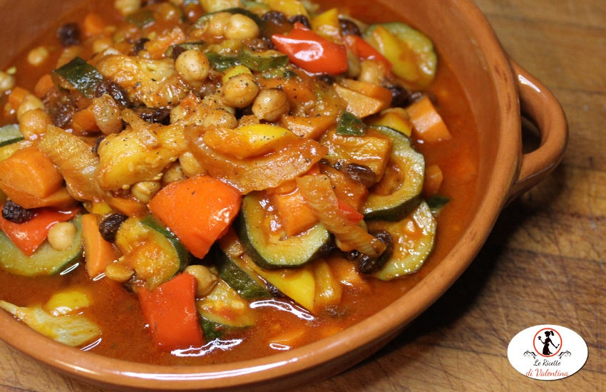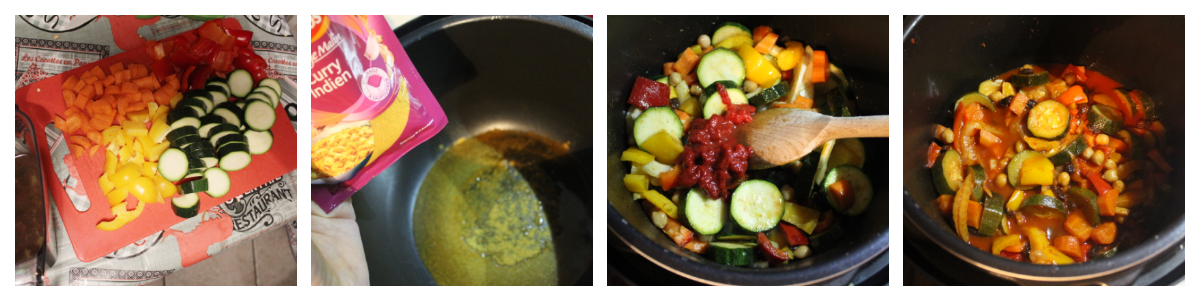 Scaldate l’olio con la miscela di spezie con la funzione sautè della pentola, in modo che le spezie inizino a sprigionare il loro profumo, occorreranno un paio di minuti. Aggiungete tutte le verdure e i ceci e rosolate per 5 minuti, mescolando spesso. Infine condite con il sale e il concentrato di pomodoro, mescolate ancora e chiudete la pentola e la valvola. Impostate alta pressione per 12 minuti. Terminate il programma e lasciate riposare 5 minuti a valvola chiusa. Terminate manualmente lo sfiato e aprite il coperchio.