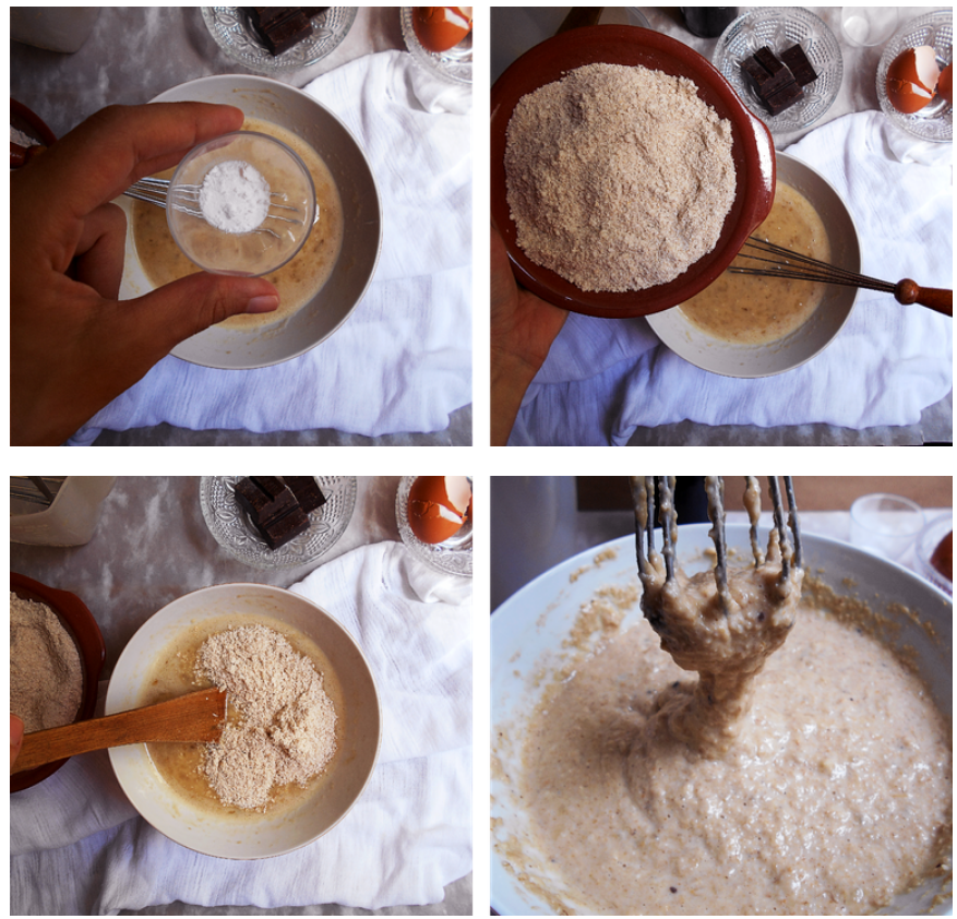 ➮FASE 2: aggiungere gli ingredienti secchi: lievito in polvere e farina d’avena. Puoi aggiungere la cannella se vuoi (non ne avevo una). Mescolare tutto molto bene fino a quando il composto non contiene grumi.