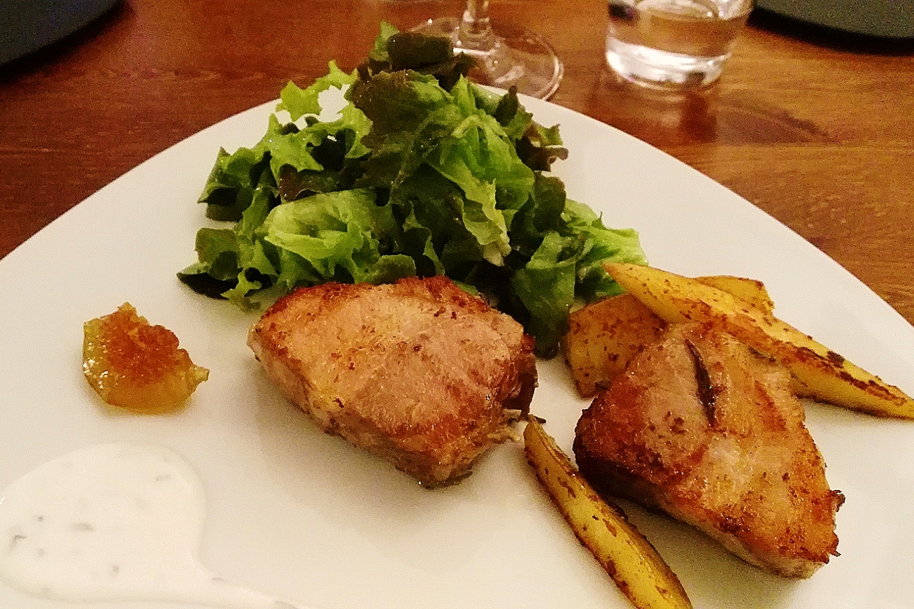 La Pancia di Maialino Aromatizzata al Timo Limone, Santolina e Maggiorana, cottura sottovuoto a bassa temperatura, accompagnata da Insalata di Montagna dell’orto di Villa Pizzini, la seconda, succulenta portata.