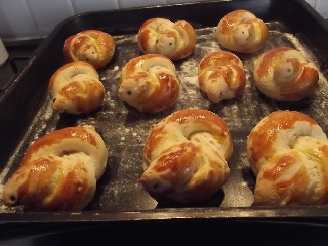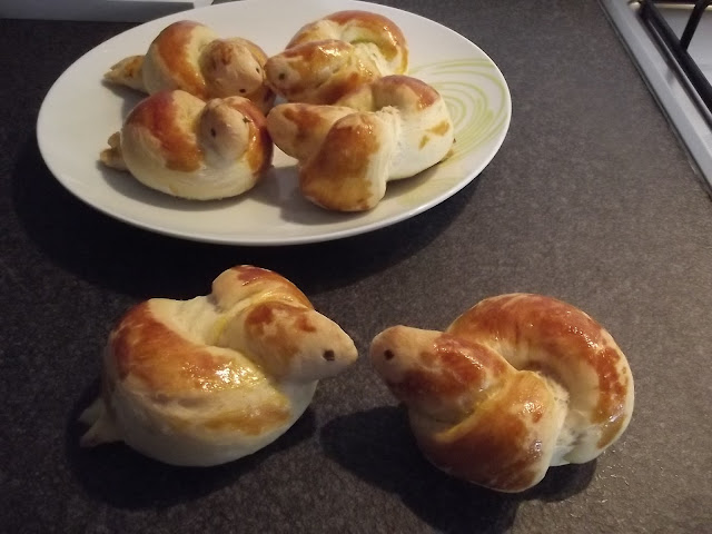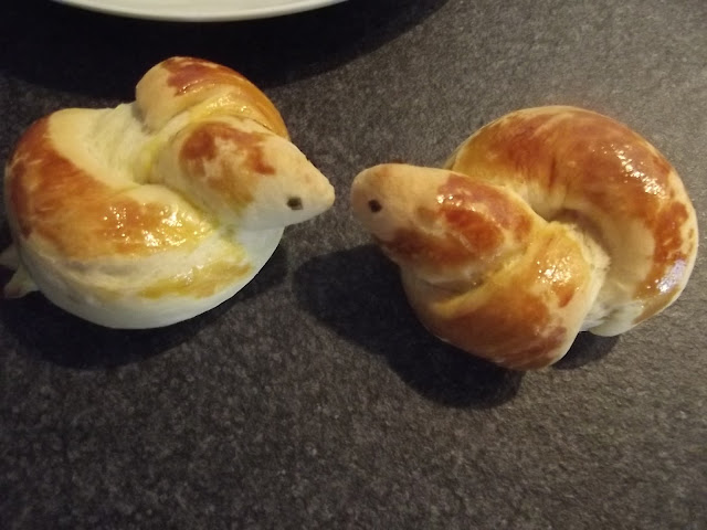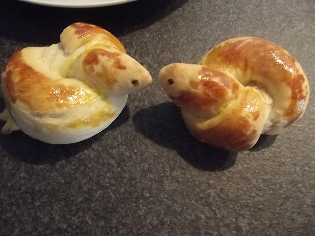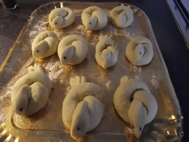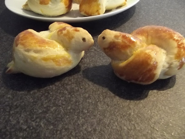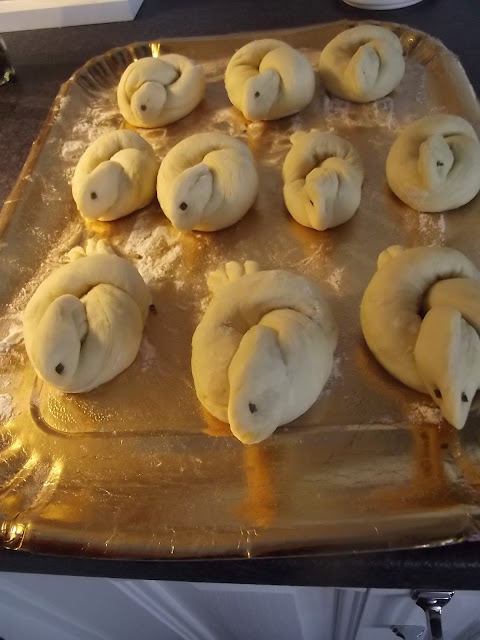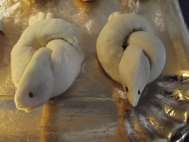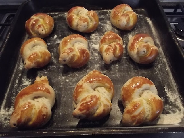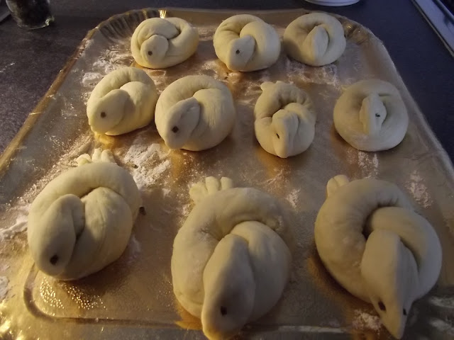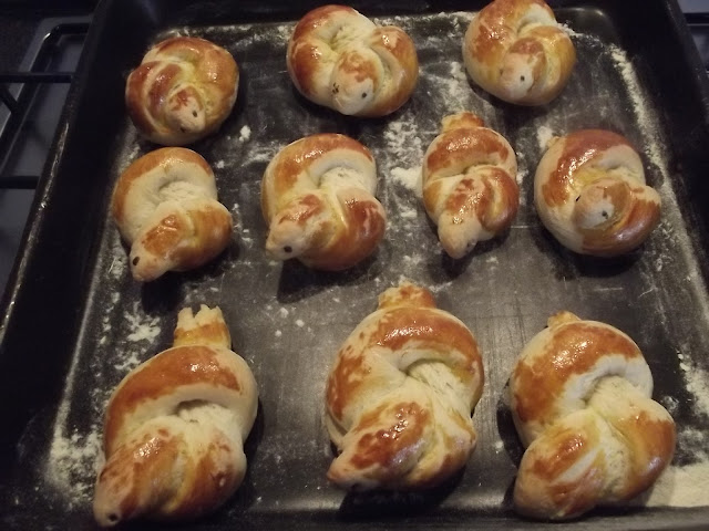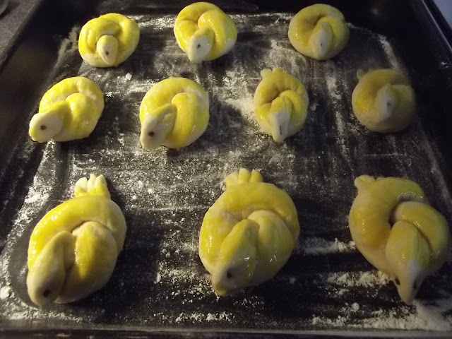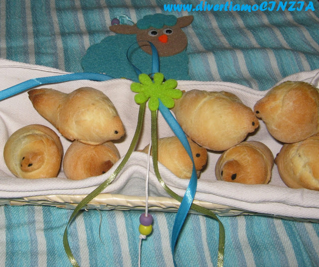 Non vi scrivo ne’ gli ingredienti ne’ il procedimento, potete vederli sul blog di Cinzia, io ho solo apportato due piccole modifiche, non avevo il pepe nero per gli occhi quindi ho messo dell’erba cipollina e ho spennellato con del rosso d’uovo le colombelle prima della cottura.