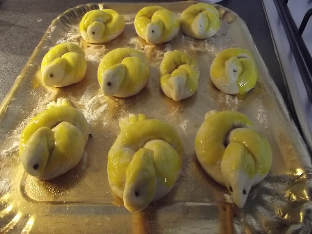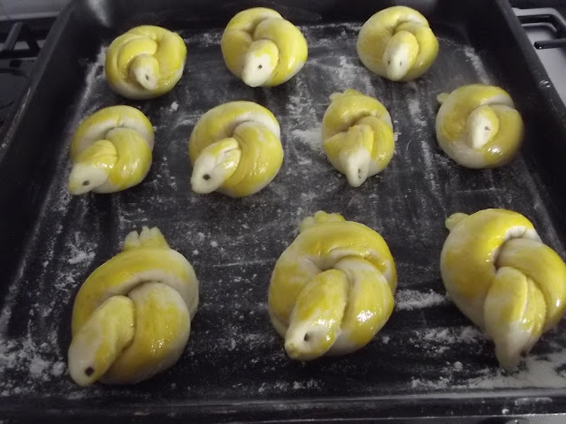 Non vi scrivo ne’ gli ingredienti ne’ il procedimento, potete vederli sul blog di Cinzia, io ho solo apportato due piccole modifiche, non avevo il pepe nero per gli occhi quindi ho messo dell’erba cipollina e ho spennellato con del rosso d’uovo le colombelle prima della cottura.