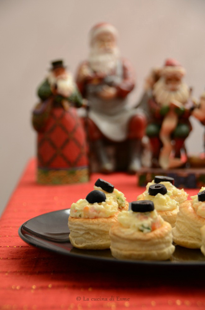 Natale con il suo carico di emozioni, con i suoi riti, le sue luci e i suoi colori, finalmente è tornato. E’ la festa più bella dell’anno, la più dolce e magica, la più condivisa, la più colma di atmosfera e fascino, la più godereccia e mangiona. In questi giorni è tutto un parlare di regali e menù, giostrandosi vorticosamente tra il traffico cittadino impazzito e i vari impegni. Non so voi, ma io vorrei le ferie natalizie … prima di Natale! Avrei tempo per dedicarmi tranquillamente ai preparativi, all’acquisto dei regali evitando i folli week end, avrei tempo per biscottare, provare nuovi dolci, o magari finalmente provare a sfornare un panettone! Comunque mancano pochi giorni e se come me siete ancora a caccia di idee per gli antipasti della vigilia vi lascio un’idea semplice, ma sempre molto scenografica e molto gradita, i vol au vent. Un finger food sfizioso, perfetto tra gli antipasti per le grandi occasioni. Farciti in mille modi diversi, ogni volta trasformano un semplice cestino di dorata pasta sfoglia in una prelibatezza sempre nuova e diversa.